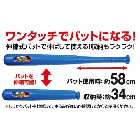 バットは伸縮式。使う時はサッと伸ばすだけ、使用後の収納もラクラク。
