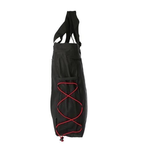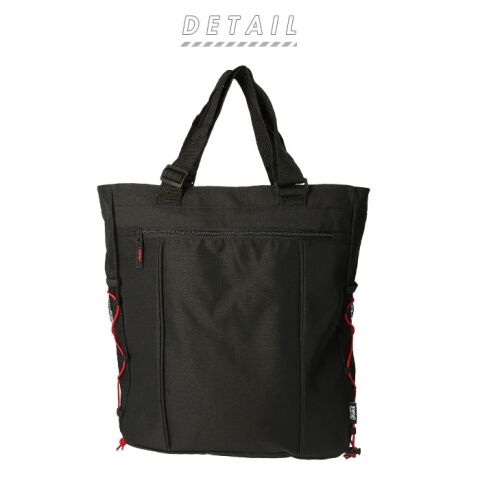 バッグ外側両サイドには、折りたたみ傘やペットボトルの収納に便利なメッシュポケット×2ヶ所。クロスしたドローコードでしっかり固定し、通気性も抜群。
