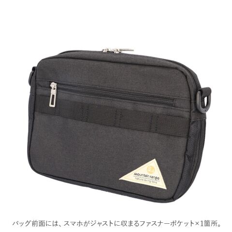 バッグ前面には、スマホがジャストに収まるファスナーポケット×1箇所。ファスナー下にはカラビナやお気に入りのチャームが取り付けられるデザインベルト付き。