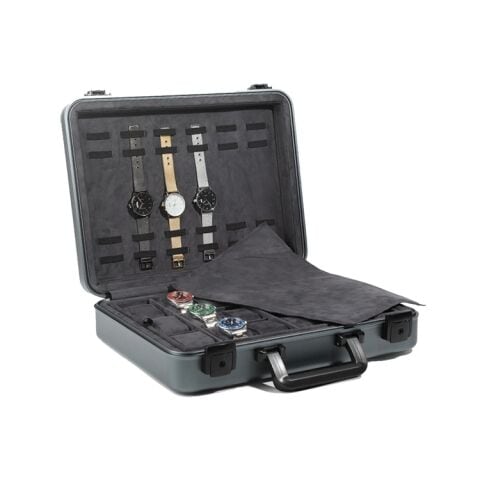 最大で18本の時計を収納し、それぞれの時計が傷やダメージから守られます。その中でも6本は革ベルト腕時計に特化したデザインです。このケースは、アルミ素材で作られており、ガンメタリック色の仕上げがモダンでスタイリッシュな印象を与えます。