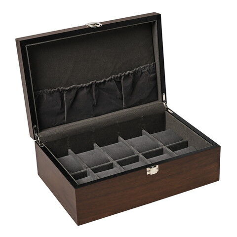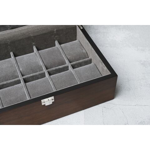 高品質のクルミの木素材を使用した10本用時計ボックスは、洗練されたデザインと機能性を兼ね備えています。その本体は深さのある容量を持ち、10本の時計を美しく収納できます。窓のないデザインは、外部の光やダストから時計を守りながら、内部のプライバシーを保護します。さらに、収納ポケットが付いており、時計以外の小物やアクセサリーを整理して収納することも可能です。