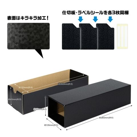仕切り版・名前シールを3 枚ずつ同梱しており、デッキやカード種別ごとに分けて収納可能です。