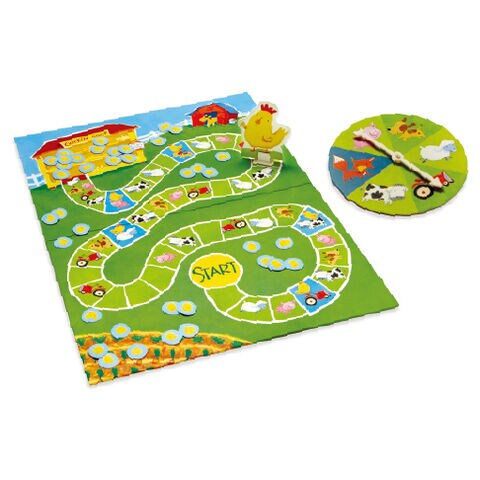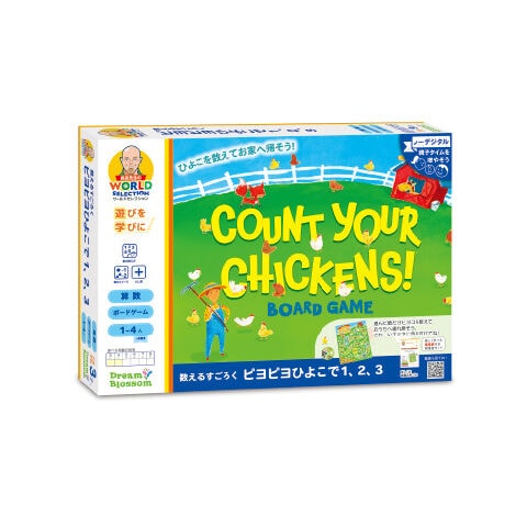 2つ折りゲームボード×1枚 ルーレット×1個 おかあさんニワトリ(スタンド付き)×1枚 ヒヨコ×40枚 日本語取扱説明書