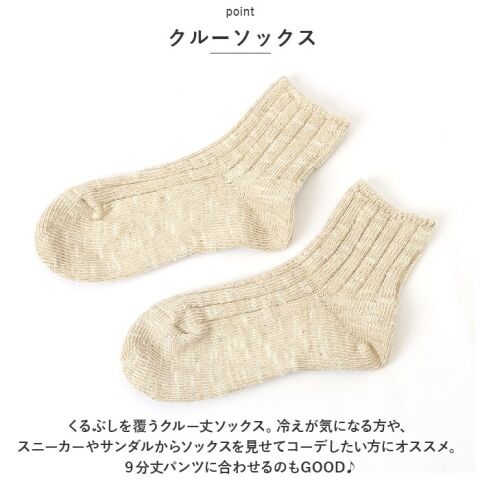 くるぶしを覆うクルー丈ソックス。冷えが気になる方や、スニーカーやサンダルからソックスを見せてコーデしたい方にオススメ。9分丈パンツに合わせるのもGOOD!