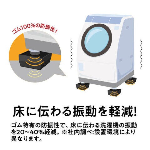 ゴム特有の防振性で、床に伝わる洗濯機の振動を20~40%軽減。※メーカー調べ:設置環境により異なります。