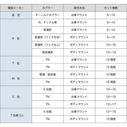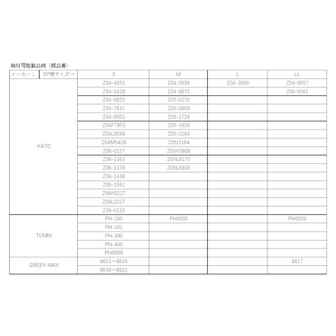日本型であれば、メーカー、車種を問わずあらゆるNゲージ車両への取り付けが可能。 Bトレイン・ショーティーにも対応。 製品に幌が付いていればそこに被せるだけの簡単装着。 製品付属の幌への引っかかりとバネの力で車体へ追従するので、接着剤やテープは要りません。 カラーは黒色をご用意。 材質は発色ステンレスを採用。光沢を抑え、実感的な見た目です。 アーノルドカプラーはもちろん、各社独自のカプラーにも対応。 上下左右、捻じれ方向へも対応。S字や半径の小さい曲線、カント付き曲線も通過可能。