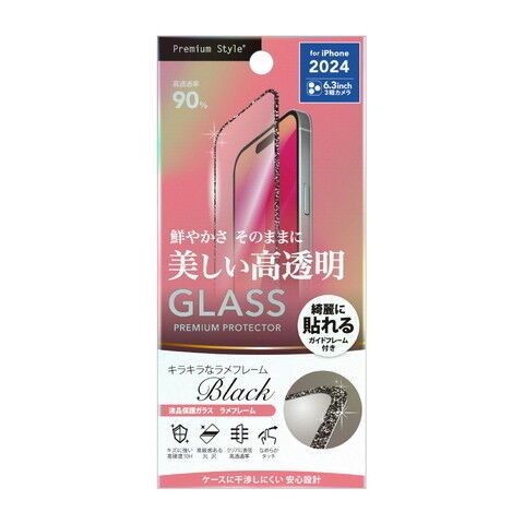 PGA iPhone 16 Pro用 液晶全面保護ガラスフィルム ラメフレーム 高透明(ブラック) PG-24BGLL01BK 【返品種別A】