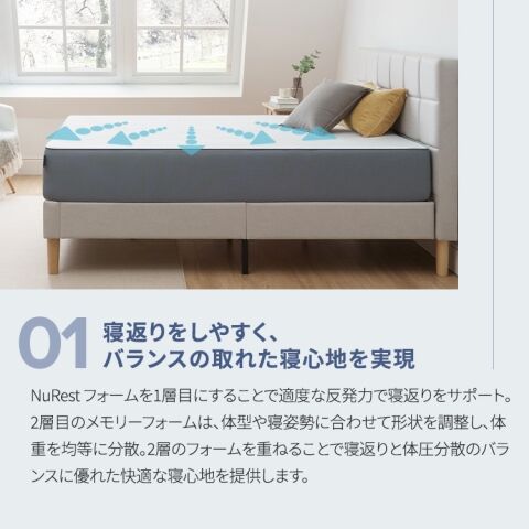 弾力のあるNuRestフォームがメモリーフォームの上に配置され、ご自分の体に合わせて快適で自然に支えます。