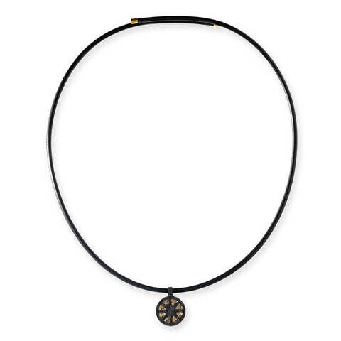 ペンダントトップはカーボンファイバーを複合したハイテク素材であるCFRP(カーボン繊維強化素材)を採用しています。CFRPは軽量でありながらあらゆる変化に強い特徴があり、極限の状況で高いパフォーマンスが求められるレーシングカーや航空、宇宙の分野で多様されることで知られています。