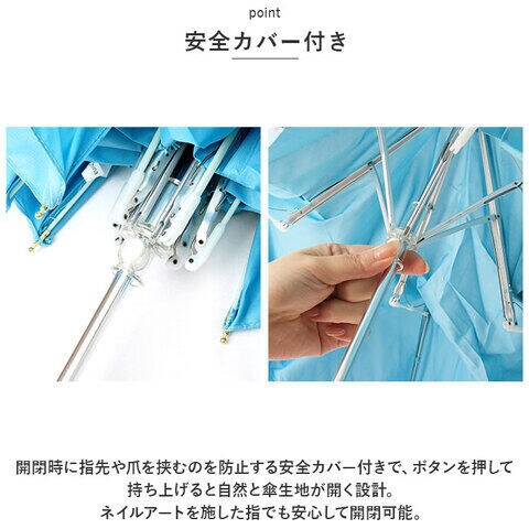 開閉時に指先や爪を挟むのを防止する安全カバー付きで、ボタンを押して持ち上げると自然と傘生地が開く設計。