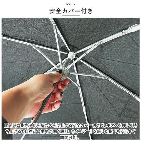 開閉時に指先や爪を挟むのを防止する安全カバー付きで、ボタンを押して持ち上げると自然と傘生地が開く設計。