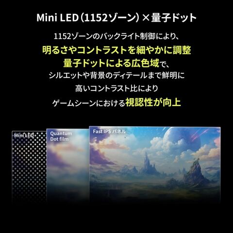 最大320Hzのリフレッシュレートと1ms(最小値)の応答速度、QD-MiniLEDによる高コントラスト・高精細を実現。