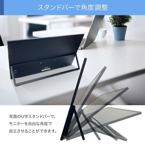 背面のスタンドバーで角度を自由に調整でき、出先では机にそのまま設置可能。