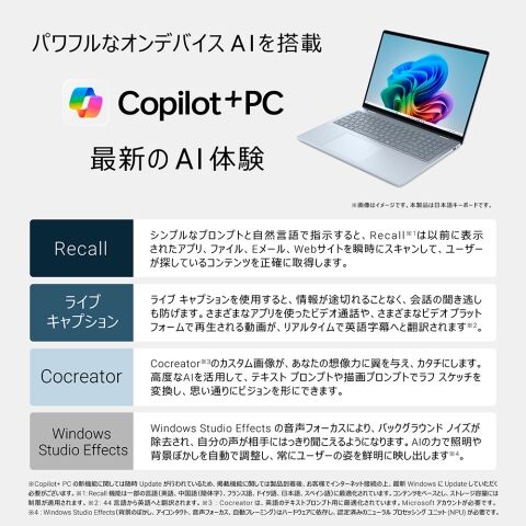 ※ Copilot+PCの新機能に関しては随時Updateが行われているため、掲載機能に関しては製品到着後、お客様でインターネット接続の上、最新Windows にUpdateしていただく必要がございます。
