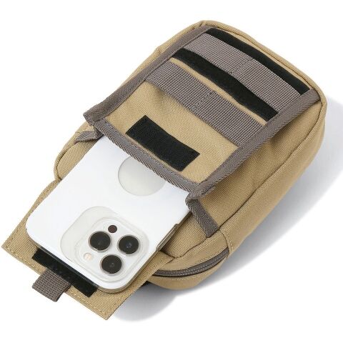 ◆フロントポケット。メインルームにはスマートフォンや使用頻度の高い、小物を素早く取り出せる。(iPhone13など6.1インチ程度であれば収納可能)