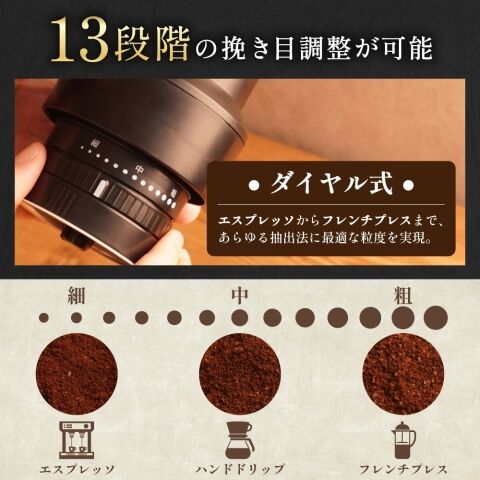 本製品は13段階の挽き目調整機能を搭載。ダイヤルを回すだけの簡単操作で挽き目を調整でき、エスプレッソやドリップコーヒー、フレンチプレスなど、お好みの抽出方法に合わせて豆を挽けます。