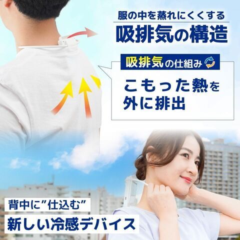 ひんやり背中を直接冷やすことに加え、服の中のこもった熱を服の外に排出する吸排気の仕組みを搭載。