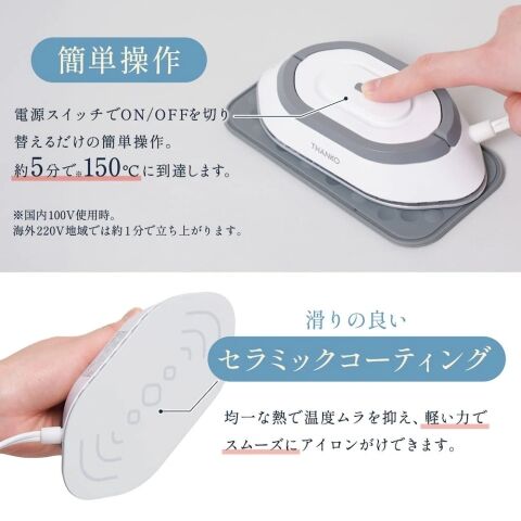 変圧器不要で海外でもそのまま使える、手のひらサイズのポータブルアイロンです。