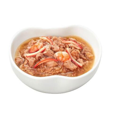 魚介類(カツオ、マグロ、青魚、えび、かにかま、フィッシュペプチド)、鶏肉、油脂類(鶏脂、大豆油)、たんぱく加水分解物、小麦グルテン、糖類(ショ糖、オリゴ糖)、乾燥全卵、エンドウたんぱく、乾燥卵黄、増粘安定剤(加工でん粉、増粘多糖類)、調味料、ミネラル類(Ca、P、Fe、Cu、Mn、Zn、I、Se)、ポリリン酸Na、キシロース、ビタミン類(A、D、E、K、B1、B2、B6、B12、ナイアシン、パントテン酸、葉酸、ビオチン、コリン)、タウリン