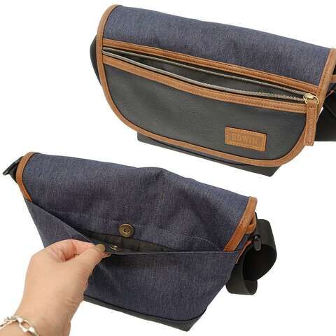 ◆合皮とデニム調ポリエステル生地の切り替えデザインがポイント