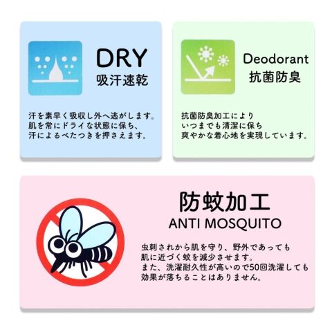 ◆吸水速乾・抗菌防臭・防蚊機能を備え、暑い季節も快適に過ごせるアイテムです。