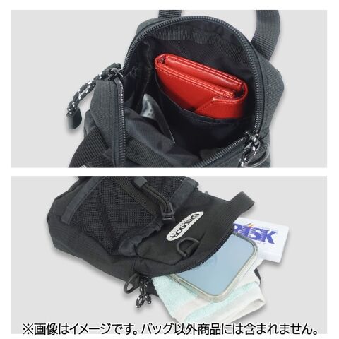 ◆台形フォルムとメッシュ素材のドリンクホルダーポケットが特徴的なミニサイズのショルダーバッグです。