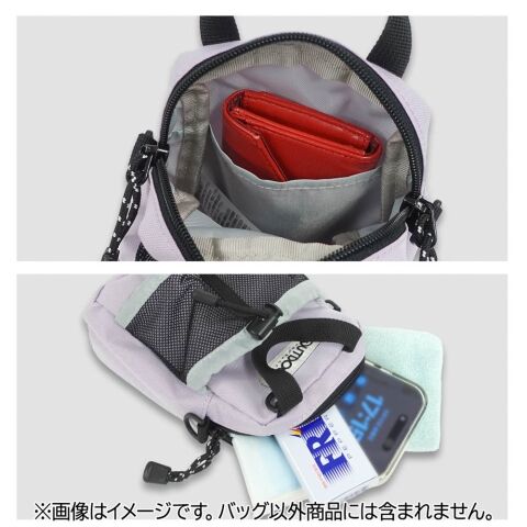 ◆台形フォルムとメッシュ素材のドリンクホルダーポケットが特徴的なミニサイズのショルダーバッグです。