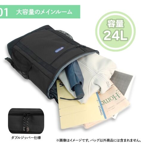 ◆両サイドにはメッシュポケットを配し、ペットボトルや折りたたみ傘をすっきり収納できます。