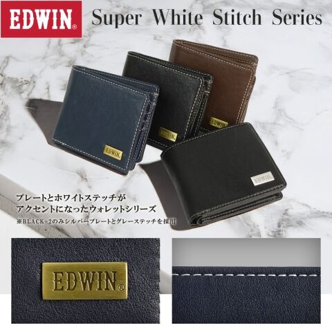 ◆ジーンズなどでお馴染みの人気ブランド【EDWIN(エドウイン)】から、艶感のあるシボ合皮にロゴプレートとステッチワークが映える二つ折り財布が登場。