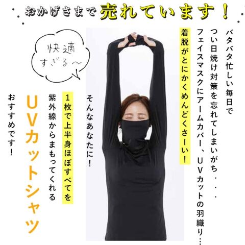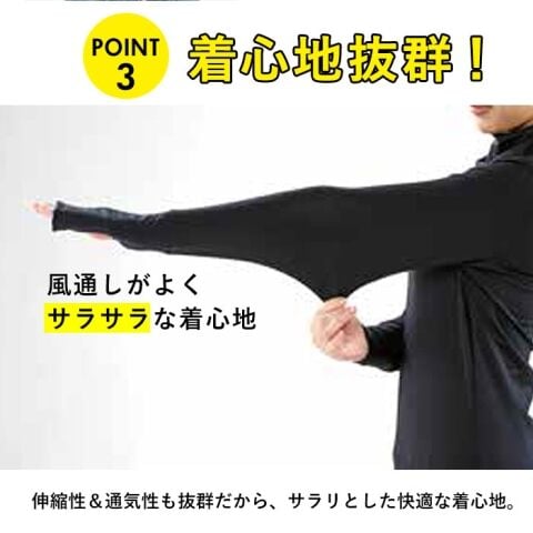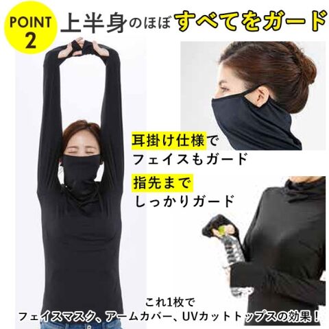 顔半分までカバーする長めのネックと、指先まで覆う袖の長さがポイント! うっかり焼けをとことん防いでくれるデザイン。