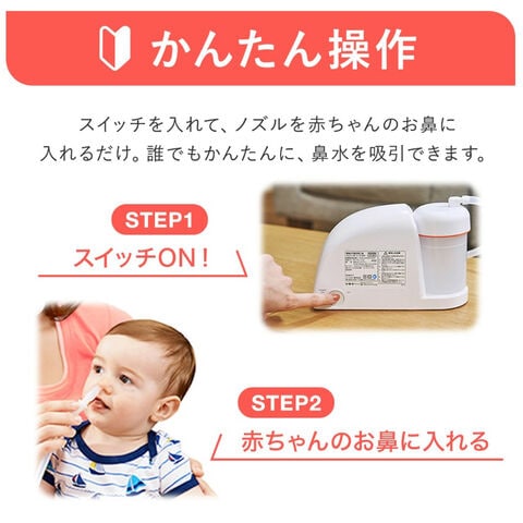 スイッチを入れて、ノズルを赤ちゃんのお鼻に入れるだけ。