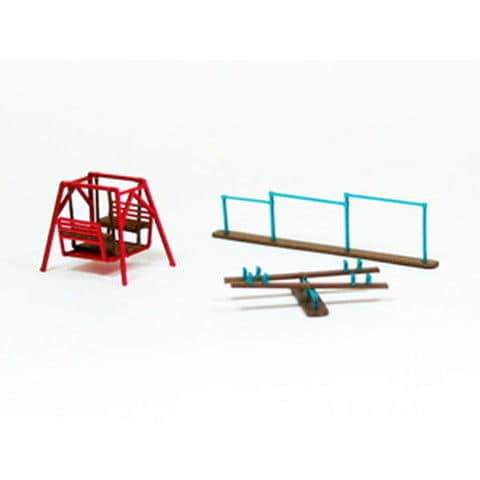 スケール:1/150 セット内容:遊具Bキット(箱ブランコ、シーソー、鉄棒)、組み立て説明書 材質:ペーパー製 パッケージ:W50×H140mm 箱ブランコ:17mm シーソー:20mm 鉄棒:30mm 組み立て所要時間:約30分