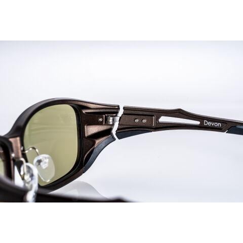 遮光性を高めるサイドフレーム、柔軟なβチタン製バネヒンジなど必要な機能はもれなく搭載。