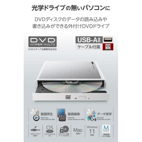 Logitec|ロジテック DVDドライブ 外付け 再生・編集・書き込みソフト一式 PowerDVD+PowerDirector+Power2Go M-DISC対応 USBバスパワー+外部電源ポート Windows 11/10 macOS対応(ホワイト) LDR-PMM8U2VWH 【返品種別B】