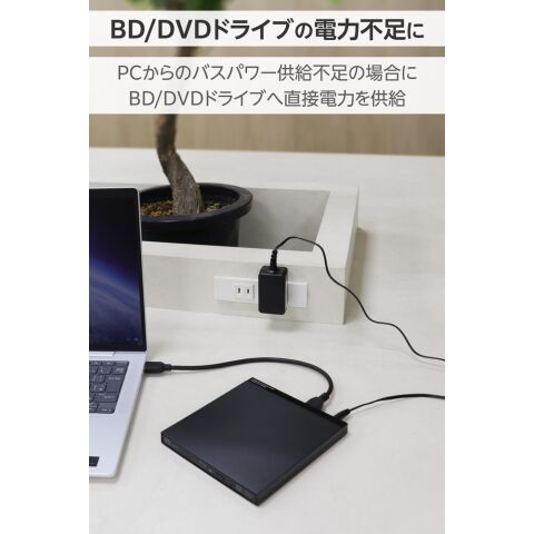 バスパワー駆動では使用できないパソコンでも、電力を補助することでポータブルDVDやブルーレイドライブ製品を使用可能にするACアダプターです。