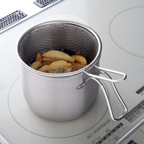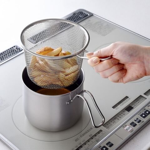 ◆ストレーナーでから揚げやフライドポテトなどを一気に引き上げられ、時間差による揚げムラを防ぎます。野菜などを洗ったりザルとして使っても便利です。