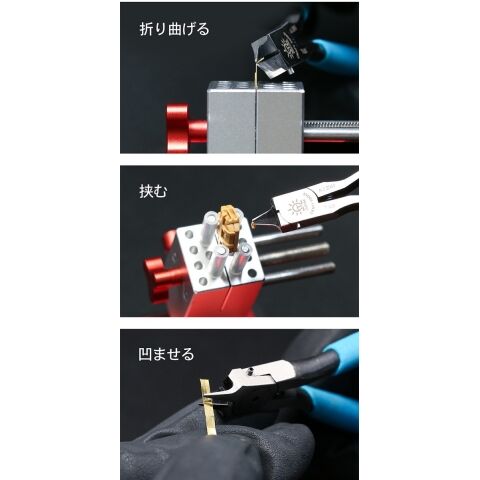 刃の無い設計により部品を傷めずに加工でき、折り曲げる、挟む、凹ませる等の工程が簡単に完了します