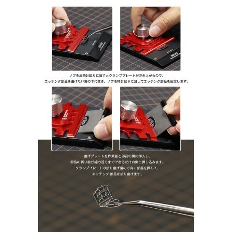ミニエッチングパーツベンダーのクランププレートにはサポートスプリングが付いており、 ノブを緩めるとクランププレートが自動的に上方に開き、 エッチングシートをはさむことができます。