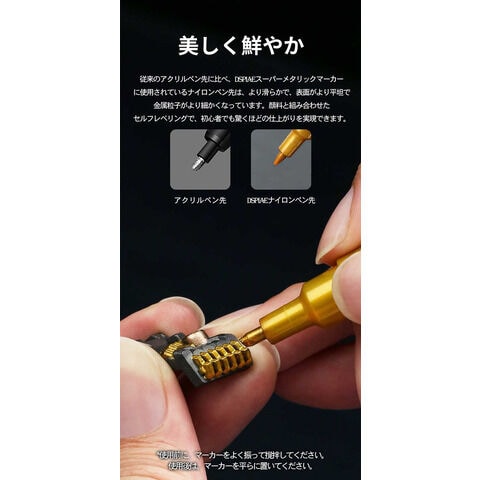 従来のアクリルペン先に比べ、DSPLAEスーパーメタリックマーカーに使用されているナイロンペン先は、より滑らかで、表面がより平坦で金属粒子がより細かくなっています。