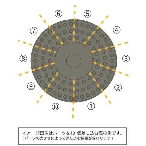 本体表面の穴は、放射状にたくさん設けているので、パーツのサイズに合わせて間隔を保ちながら差し込むスペースを確保できます。