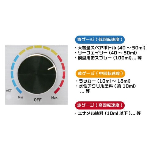 黄ゲージ(中回転速度):ラッカー、水性アクリル塗料(10-30ml)等赤ゲージ(高回転速度):エナメル塗料(10ml以下)等