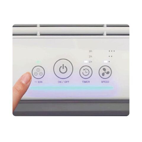 「-ION」ボタンを指で1回タッチすると、アイコン上部のLEDが白色に点灯し、マイナスイオンを放出します。