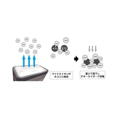 放出されるマイナスイオンは空気中に舞うホコリと結合します。結合を繰り返すことで重くなったホコリはやがて落下します。