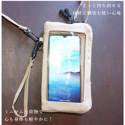 ポーチに入れたままスマホの操作ができる、背面クリアポケット仕様。(※お手持ちのスマートフォンのサイズをご確認ください。)