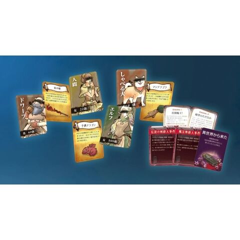 キャラクター設定カード:12枚 事件カード:8枚 被害者設定カード:20枚 暴露カード:48枚 スタートプレイヤー(異世界転生者)カード:1枚 エンディングカード:8枚 サマリーカード:4枚 フィールドカード:8枚 ルールブック:1冊