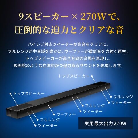 9つのスピーカーと最大270Wのマルチアンプによるパワフルサウンド。ハイレゾ対応ツィーターで繊細な高音、バズーカ・ウーファーで迫力の低音、トップスピーカーで高さ方向の広がりまで、映画も音楽もゲームも、空間全体に響き渡る臨場感を実現します。