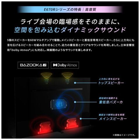 実用最大出力合計値60Wのマルチアンプを採用し、合計5個のスピーカーでパワフルで臨場感あふれるサウンドを再現。音域のつながりを向上させる高遮断クロスオーバーフィルターに加え、立体音響技術「Dolby Atmos(ドルビーアトモス)」にも対応しており、映画館のように立体的で迫力のあるサウンドを楽しむことができます。