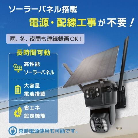 ◆ソーラーパネル/コンセントの2つの給電方式に対応