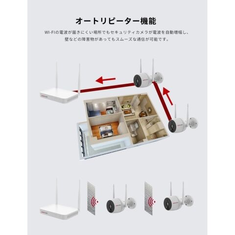 Wi-Fiの電波が届きにくい場所でもセキュリティカメラが電波を自動増幅し、壁などの障害物があってもスムーズな通信が可能
