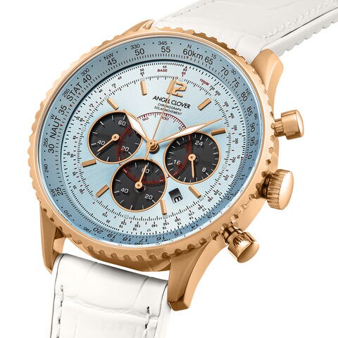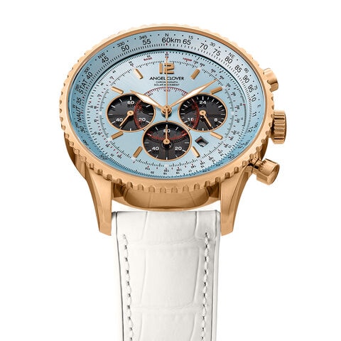 澄み渡った青空のような文字盤に、クロノグラフ60分計・1/5秒計・24時間表示を搭載。コントラストの効いた黒のインダイヤルにより、アクセントとしてはもちろん優れた視認性を発揮。さらに計器としてさまざまな意味を持つ目盛りが記された、ベゼル&ダイヤルは繊細かつ大胆。経過時刻の積算や速度の算出など、飛行に必要なあらゆる計算が可能な高い機能性を備えた、空に通ずるパイロットウォッチの世界観をデザイン・仕様・カラーリングで表現しています。